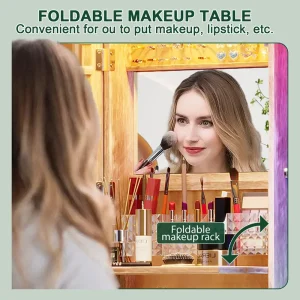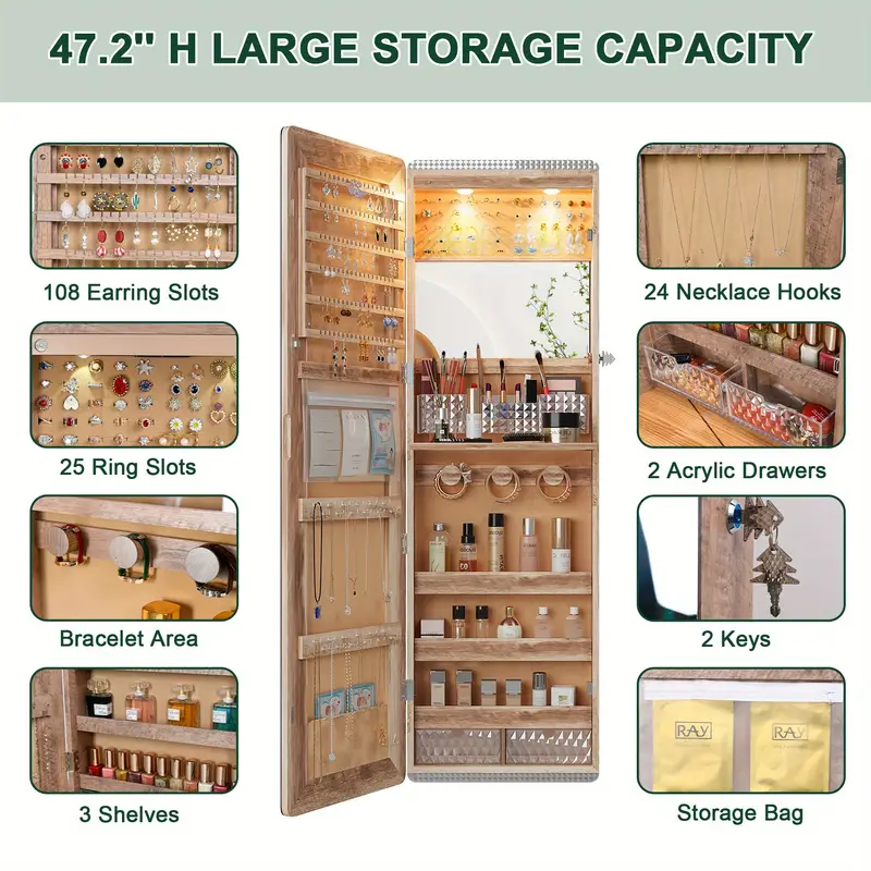 HNEBC LED Mirror Jewelry Cabinet with RGB Lights, 47.2″ Wall-Mounted Wooden Armoire Organizer, Full-Length Mirror, 2 Drawers, Lockable Storage for Bedroom & Bathroom, Contemporary Design, White Hardwood Finish
